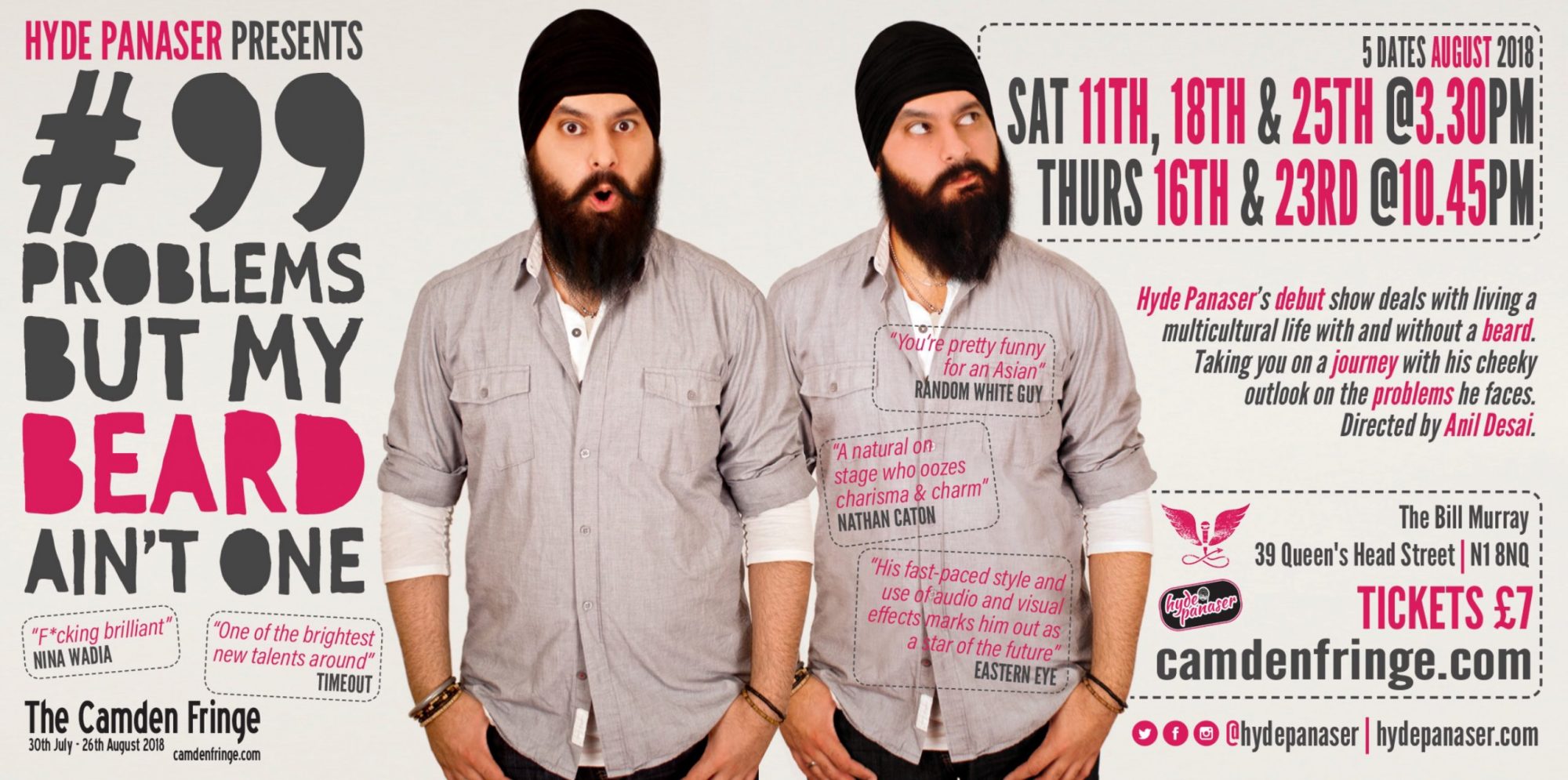 It’s my debut solo show, “99 Problems But My Beard Ain’t One“. If theres anything you wanted to ask a bearded or turbaned person, then the likelihood is that its covered in the show! Or, why not come and ask it! I’ll be going through what i’ve come up against with and without the beard living in a multicultural society!